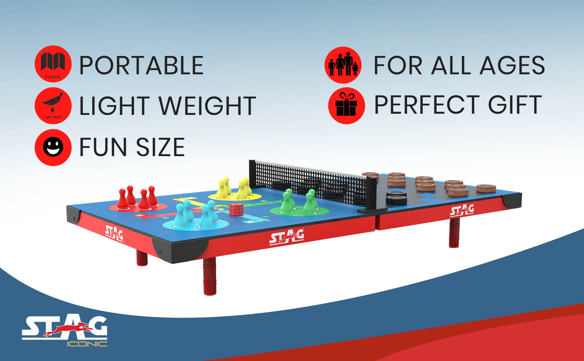 - Packaging Includes: 1 Stag Iconic 4-in-1 Mini Table Tennis Table with Accessories (2 Rackets, 2 Balls, 1 Net and Post Set, Ludo Pieces, Checkers Pieces, and Chessmen).